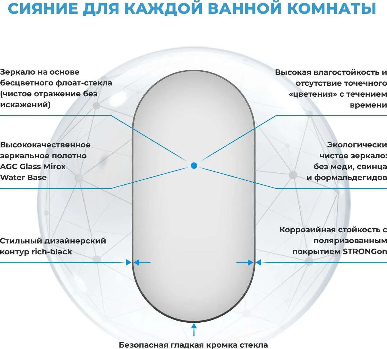 Безупречное японское стекло — результат непрерывного развития технологий, оно соответствует единой системе защиты от коррозии и отсутствию точечного «цветения» с течением времени. Периметр зеркального полотна декорирован тонким черным контуром, при облучении которого отверждаемые УФ-чернила значительно повышают прочность сцепления.