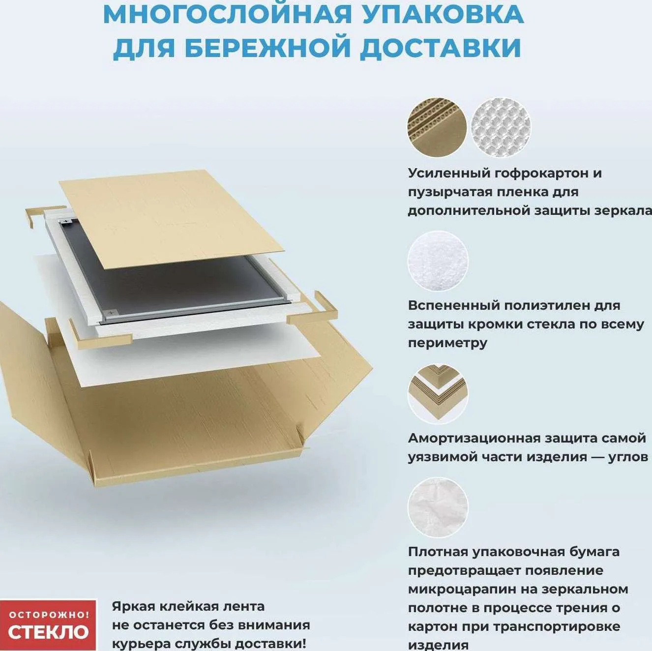 Каждое зеркало тщательно упаковано. Многослойная упаковка из плотного гофрированного картона и пузырчатой пленки защищает все элементы от трещин и сколов, а специальная бумага – от появления микроцарапин на зеркальном полотне. На углы установлена дополнительная защита, а кромка зеркала со всех сторон укрыта вспененным полиэтиленом. Бережное отношение во время транспортировки, погрузки и разгрузки помогает сохранить геометрию конструкции, а каждую позицию из заказа доставить в первозданном виде. В комплект входит инструкция и крепежный комплект.