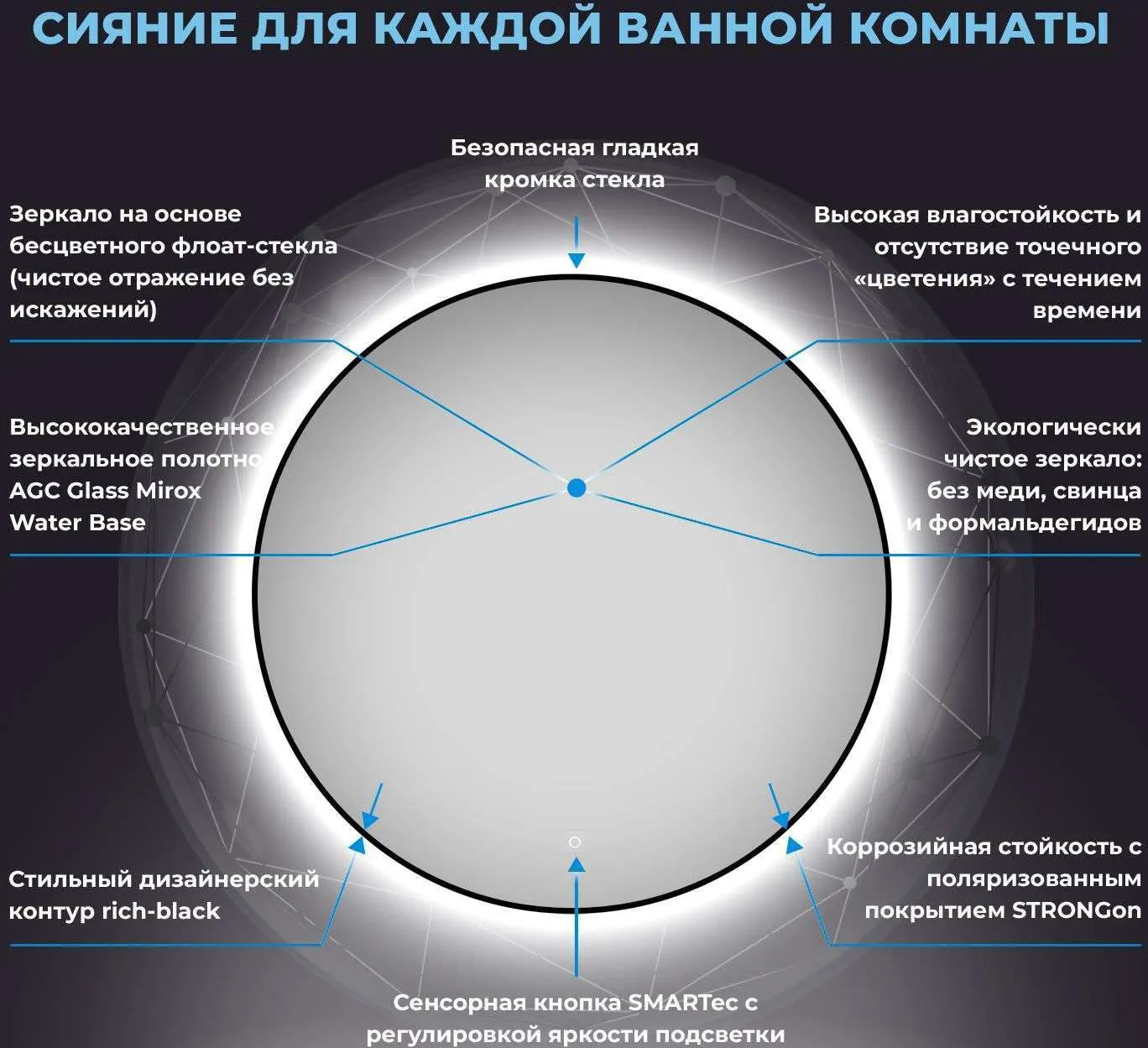 Безупречное японское стекло — результат непрерывного развития технологий, оно соответствует единой системе защиты от коррозии и отсутствию точечного «цветения» с течением времени. Периметр зеркального полотна декорирован тонким черным контуром, при облучении которого, отверждаемые УФ-чернила значительно повышают прочность сцепления.