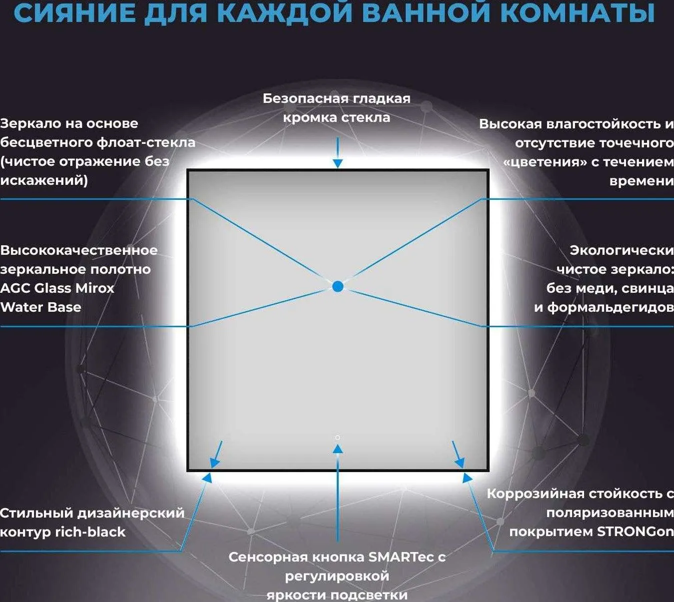 Экологически чистое зеркало на основе бесцветного флоат-стекла меняет визуальное восприятие пространства и смещает акценты, делая бледное ярким, а обычное – уникальным! Прозрачный компаунд защищает электрические диоды от случайных брызг и капель, подчеркивает красоту естественных оттенков, наполняя пространство светом и новыми ощущениями.