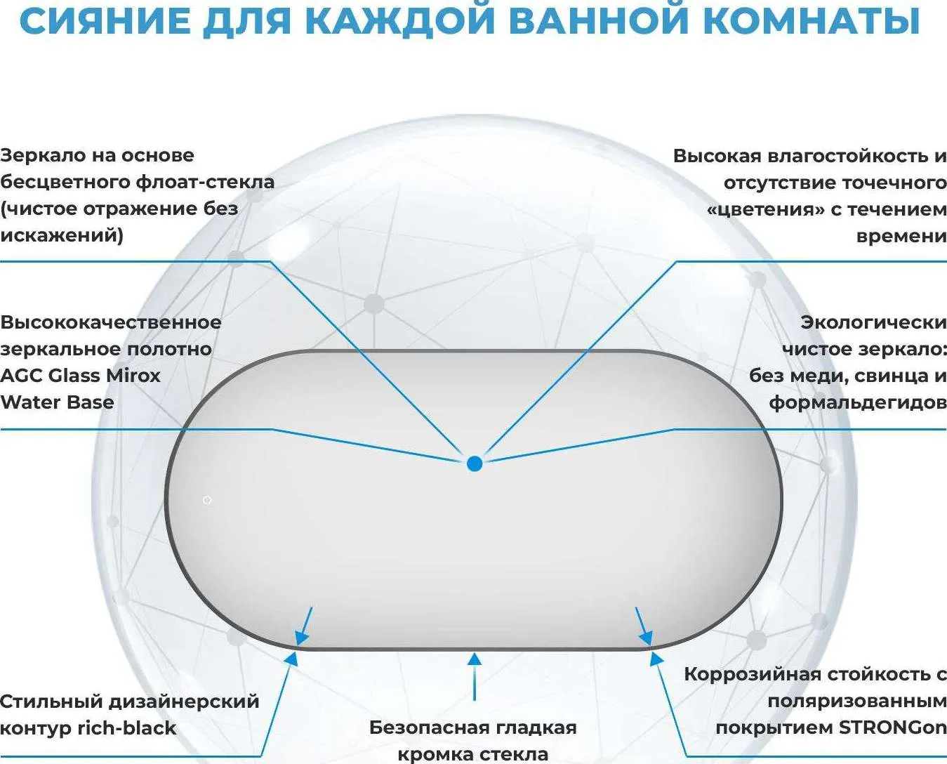 Безупречное японское стекло — результат непрерывного развития технологий, оно соответствует единой системе защиты от коррозии и отсутствию точечного «цветения» с течением времени. Периметр зеркального полотна декорирован тонким черным контуром, при облучении которого отверждаемые УФ-чернила значительно повышают прочность сцепления.