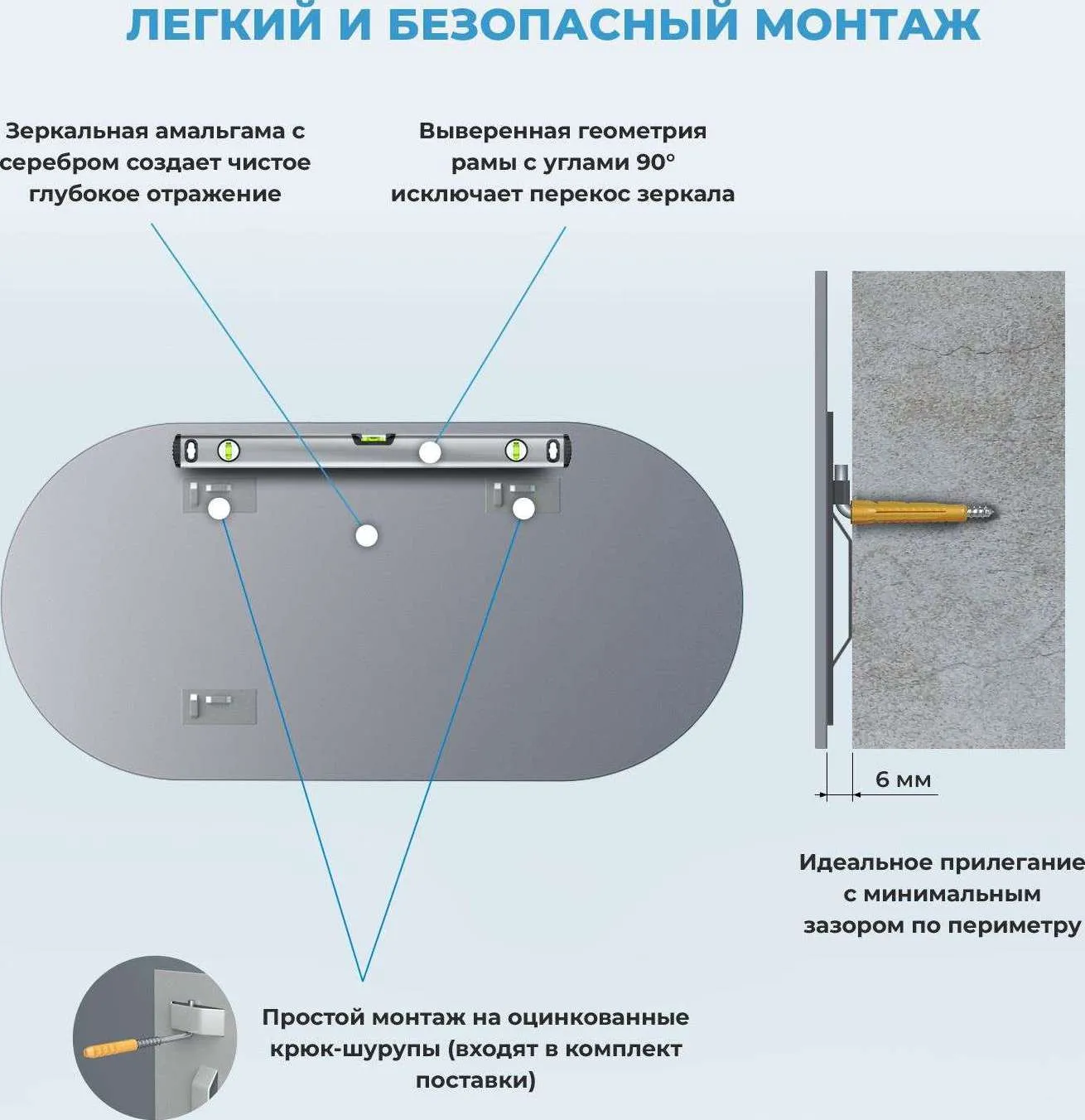 Благодаря отсутствию рамы зеркало идеально прилегает к стене и практически сливается с ее поверхностью. Заводские металлические крепления надежно удерживают всю конструкцию на крюк-дюбелях с антикоррозийным покрытием. Легкий монтаж занимает несколько минут, а навесить изделие можно самостоятельно, не прибегая к помощи профессионалов.