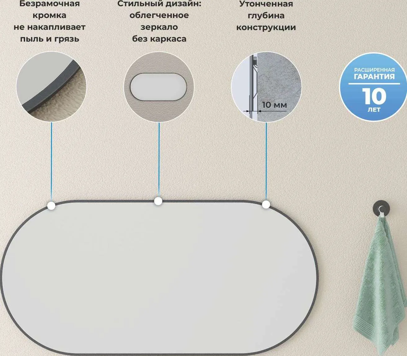 Благодаря отсутствию рамы зеркало идеально прилегает к стене и практически сливается с ее поверхностью. Заводские металлические крепления надежно удерживают всю конструкцию на крюк-дюбелях с антикоррозийным покрытием. Легкий монтаж занимает несколько минут, а навесить изделие можно самостоятельно, не прибегая к помощи профессионалов.