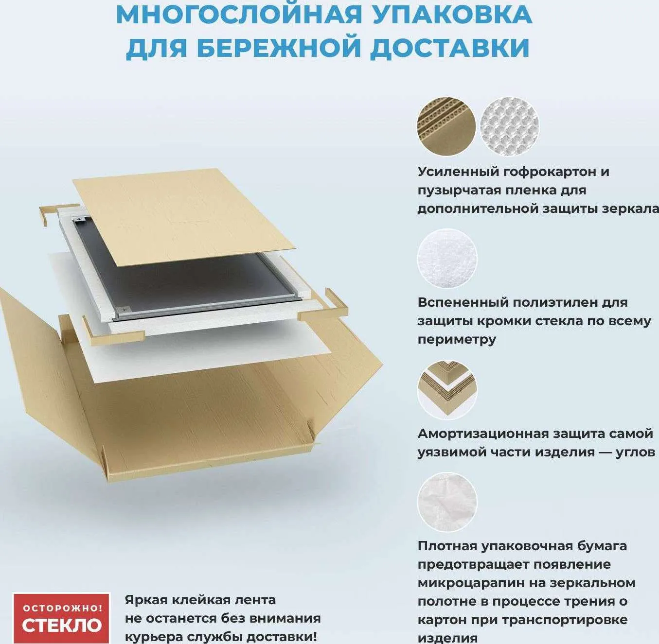 Каждое зеркало тщательно упаковано. Многослойная упаковка из плотного гофрированного картона и пузырчатой пленки защищает все элементы от трещин и сколов, а специальная бумага – от появления микроцарапин на зеркальном полотне. На углы установлена дополнительная защита, а кромка зеркала со всех сторон укрыта вспененным полиэтиленом. Бережное отношение во время транспортировки, погрузки и разгрузки помогает сохранить геометрию конструкции, а каждую позицию из заказа доставить в первозданном виде. В комплект входит инструкция и крепежный комплект.