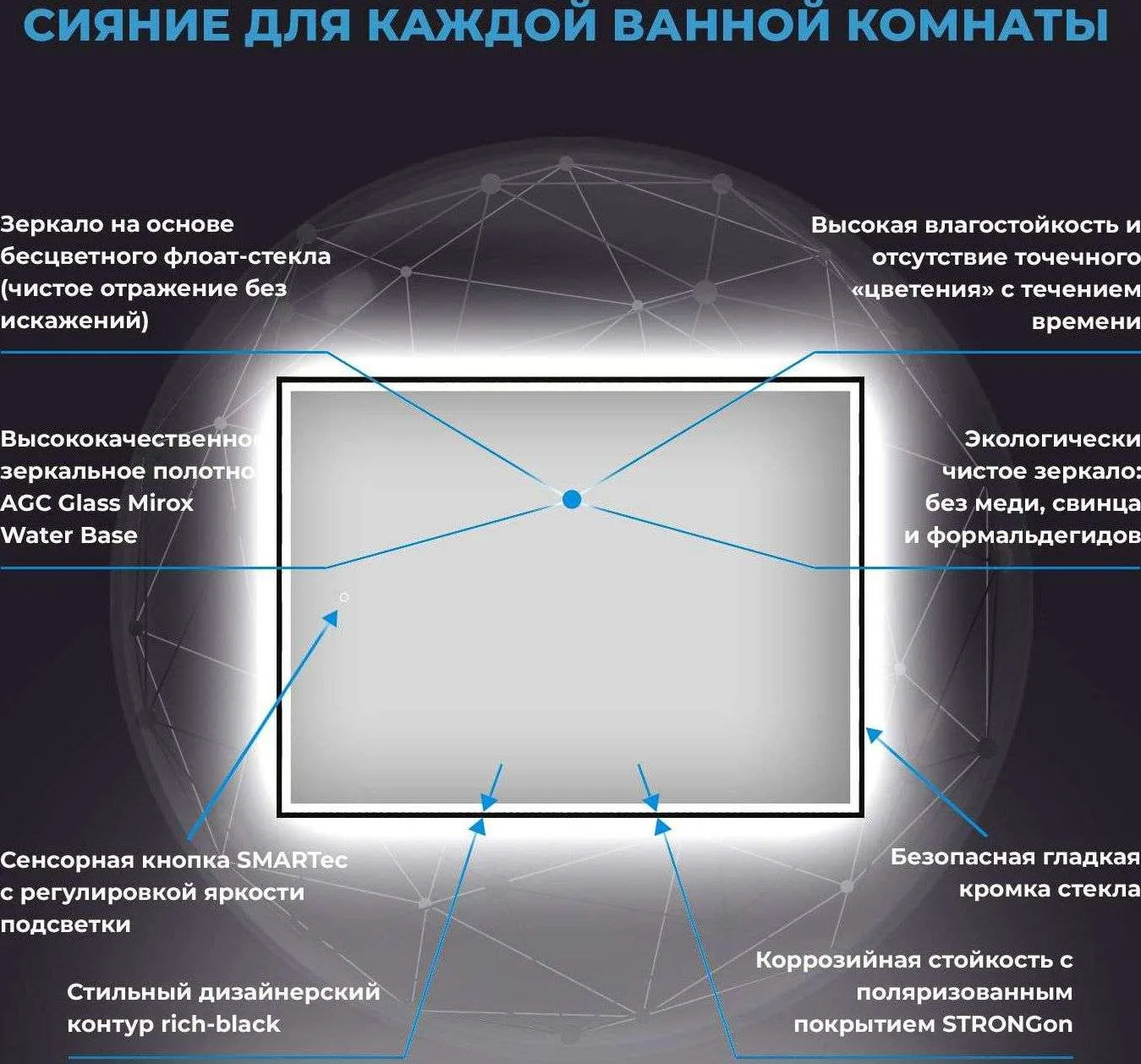 Экологически чистое зеркало на основе бесцветного флоат-стекла меняет визуальное восприятие пространства и смещает акценты, делая бледное ярким, а обычное – уникальным! Прозрачный компаунд защищает электрические диоды от случайных брызг и капель, подчеркивает красоту естественных оттенков, наполняя пространство светом и новыми ощущениями.