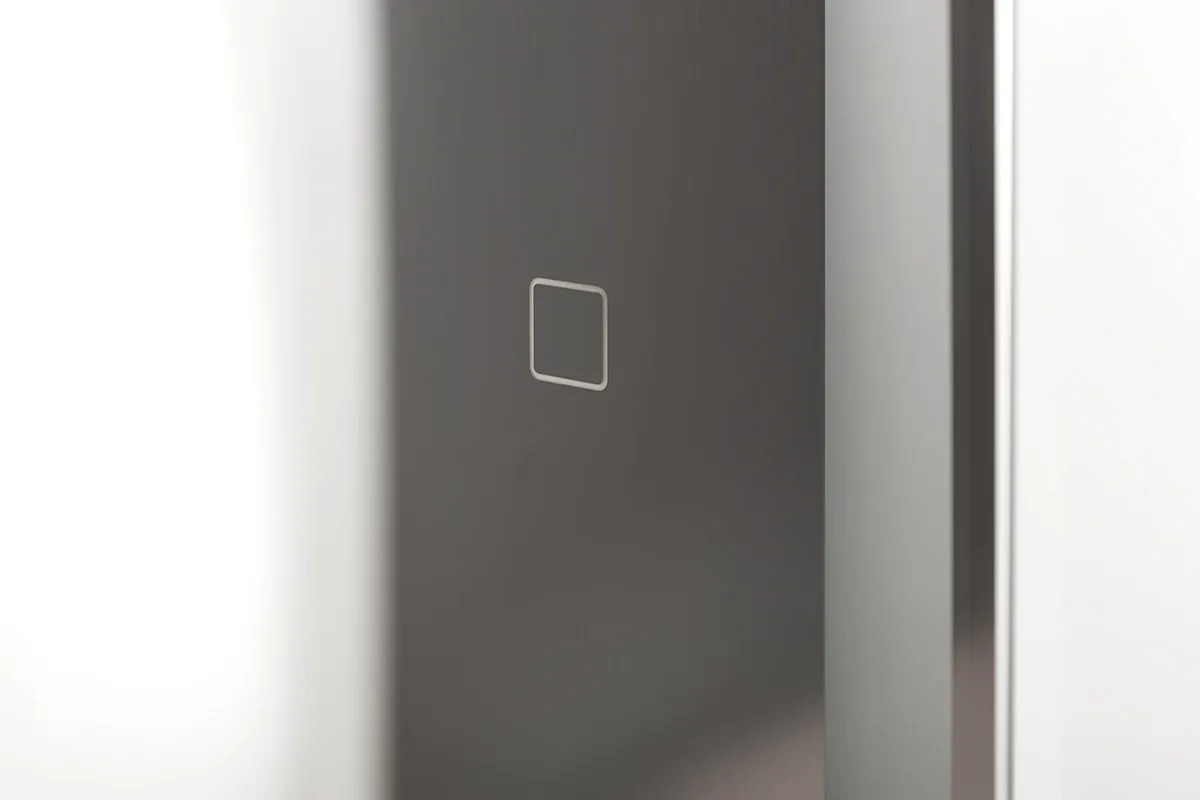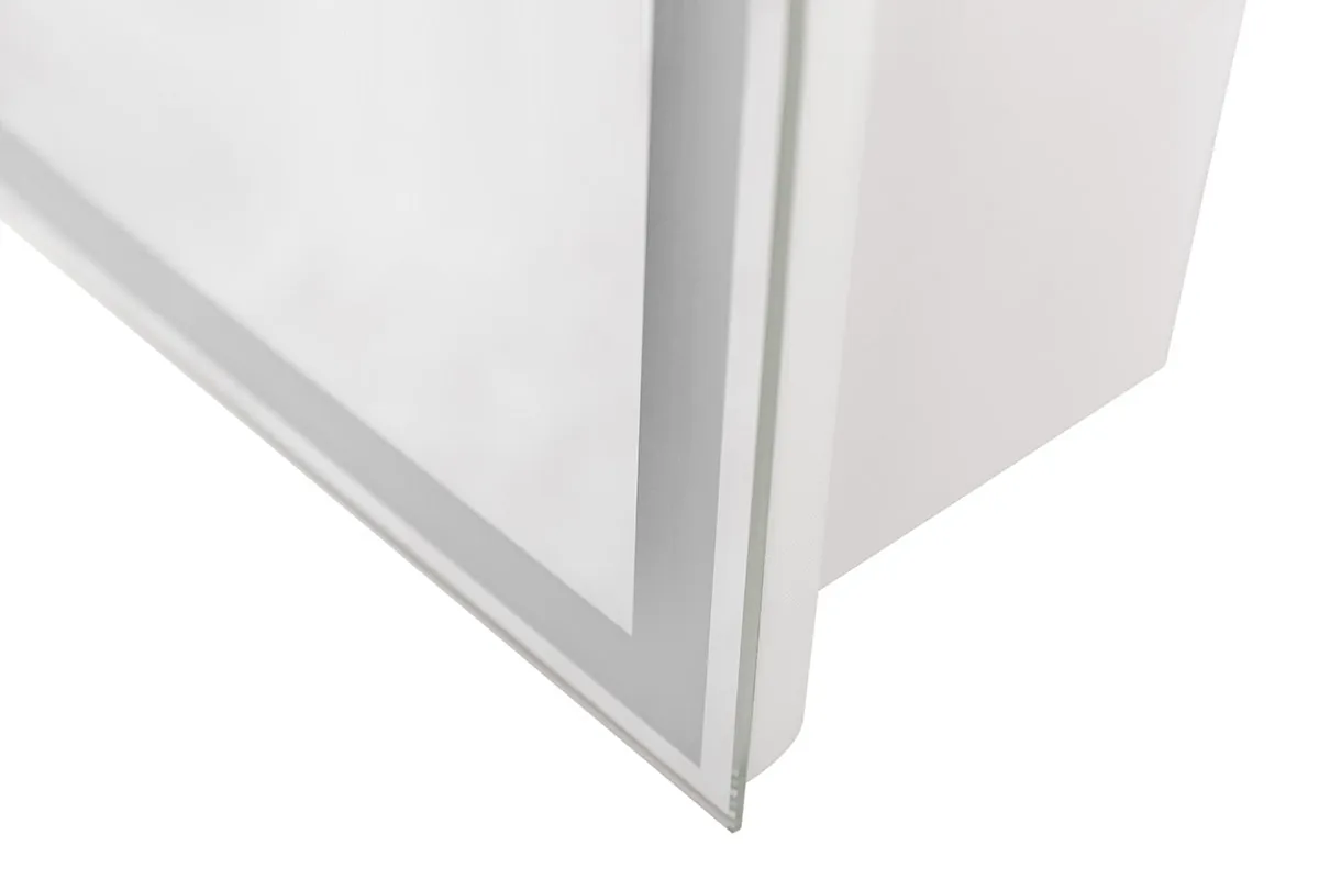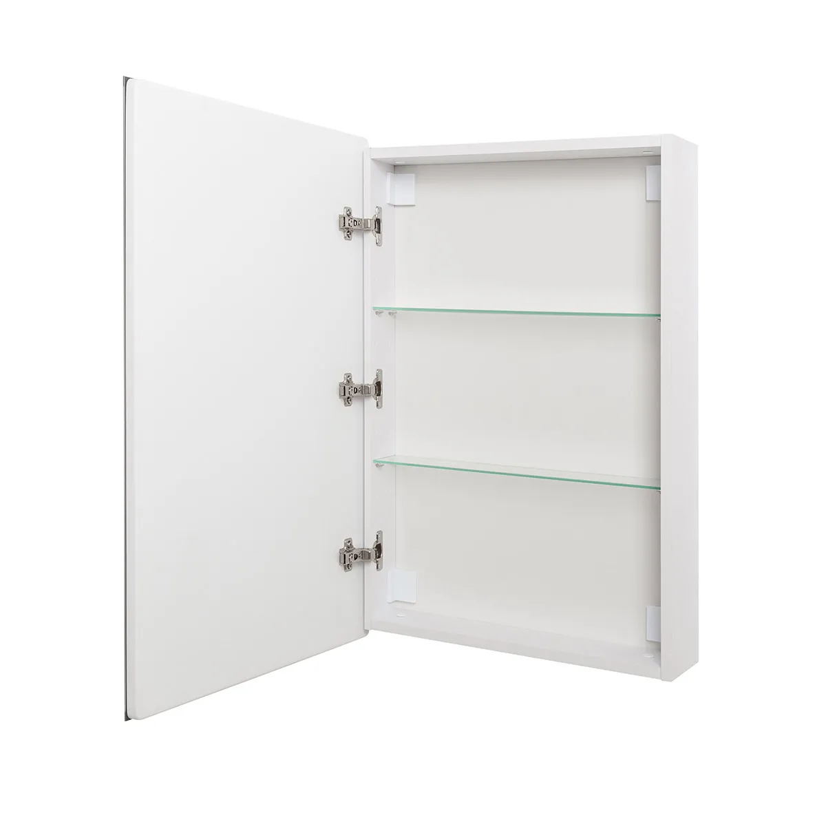Зеркальный шкаф с одной распашной дверью, реверсный (правый или левый), со встроенной подсветкой и сенсорным выключателем. Петли с доводчиком. Лента закрыта коробом из светорассеивающего пластика, питание через петлю. Две стеклянные полки с возможностью регулировки высоты, полкодержатели с силиконовыми накладками. Корпус из ЛДСП белого цвета, лента SMD 3528 IP44, 12V, 6000 К, холодный свет.