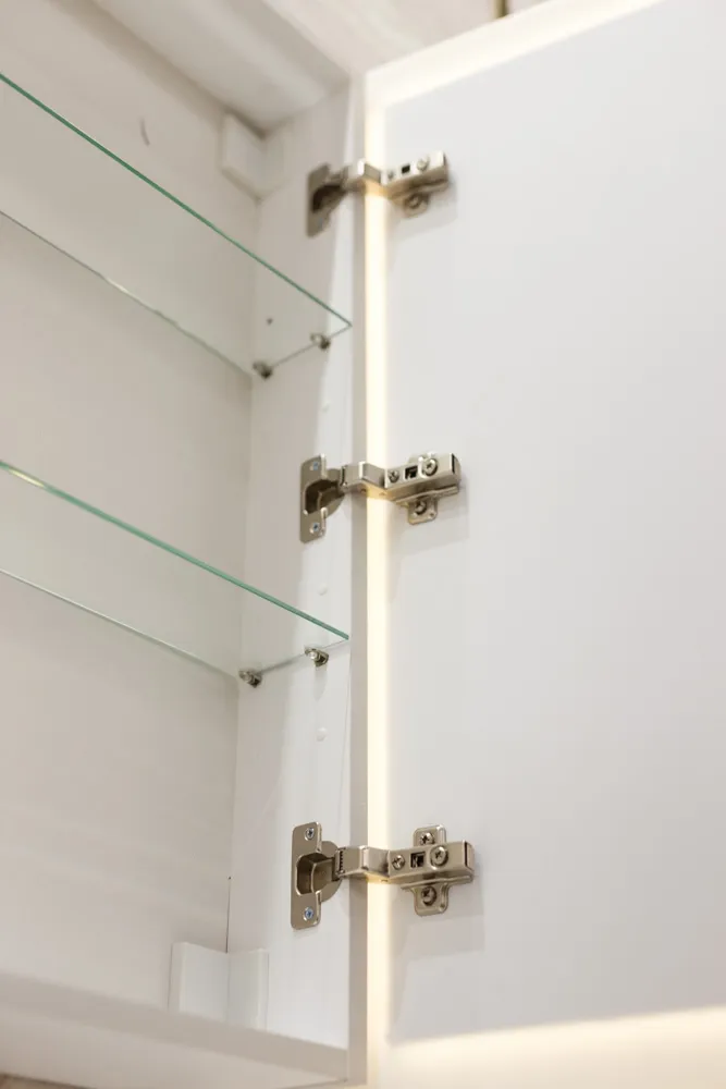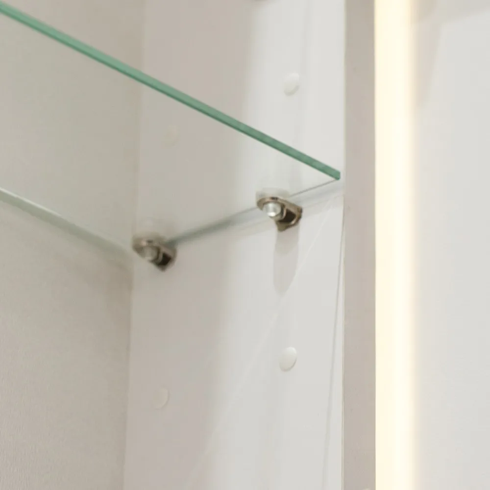Зеркальный шкаф 40x80, с одной распашной дверью, реверсный, со встроенной подсветкой и сенсорным выключателем. Лента закрыта коробом из светорасеивающего пластика, питание через петлю. Две стеклянные полки с возможностью регулировки высоты, полкодержатели с силиконовыми накладками. Корпус из ЛДСП белого цвета, лента SMD 3528 IP44, 12V, 6000 К, холодный свет. Крепеж для монтажа прилагается.