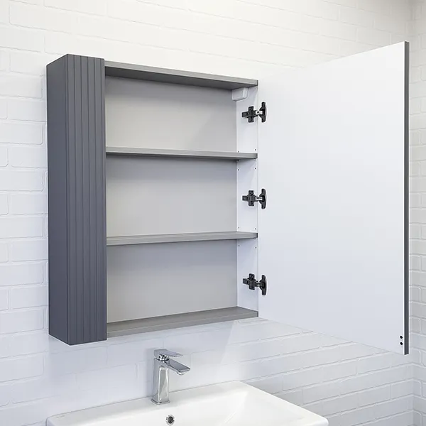 Название: Зеркало-шкаф Коллекция: Лима Артикул: 00-00004891CF Варианты цвета: Антрацит Материал панелей: МДФ Габариты (ШхВхГ): 700*800*175 мм Зеркальное высококачественное полотно с амальгамой на основе серебра. Створка декорирована вертикальной фрезеровкой и оснащена петлями плавного закрывания. За створкой две полки. В модели применяется плёнка с эффектом Soft-Touch.