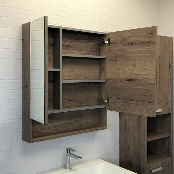 Створки оснащены петлями с плавным закрыванием. Высококачественное зеркальное полотно с амальгамой на основе серебра. Обе боковые створки зеркала открываются наружу. За широкой створкой две горизонтальные полки, за узкой одна. На нижней внешней полке можно расположить невысокие принадлежности для умывания. Название: Шкаф-зеркало Артикул: 00-00008851CF Цвет: Дуб темный Габариты (ШхВхГ): 700*800*135 мм. Инструкция для мебели для ванных комнат COMFORTY